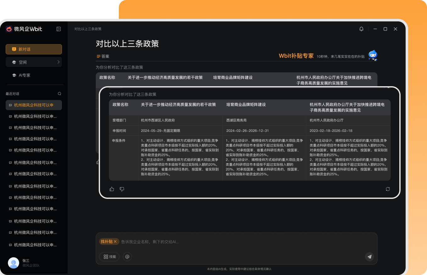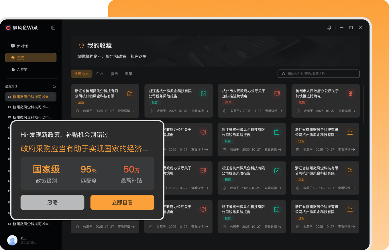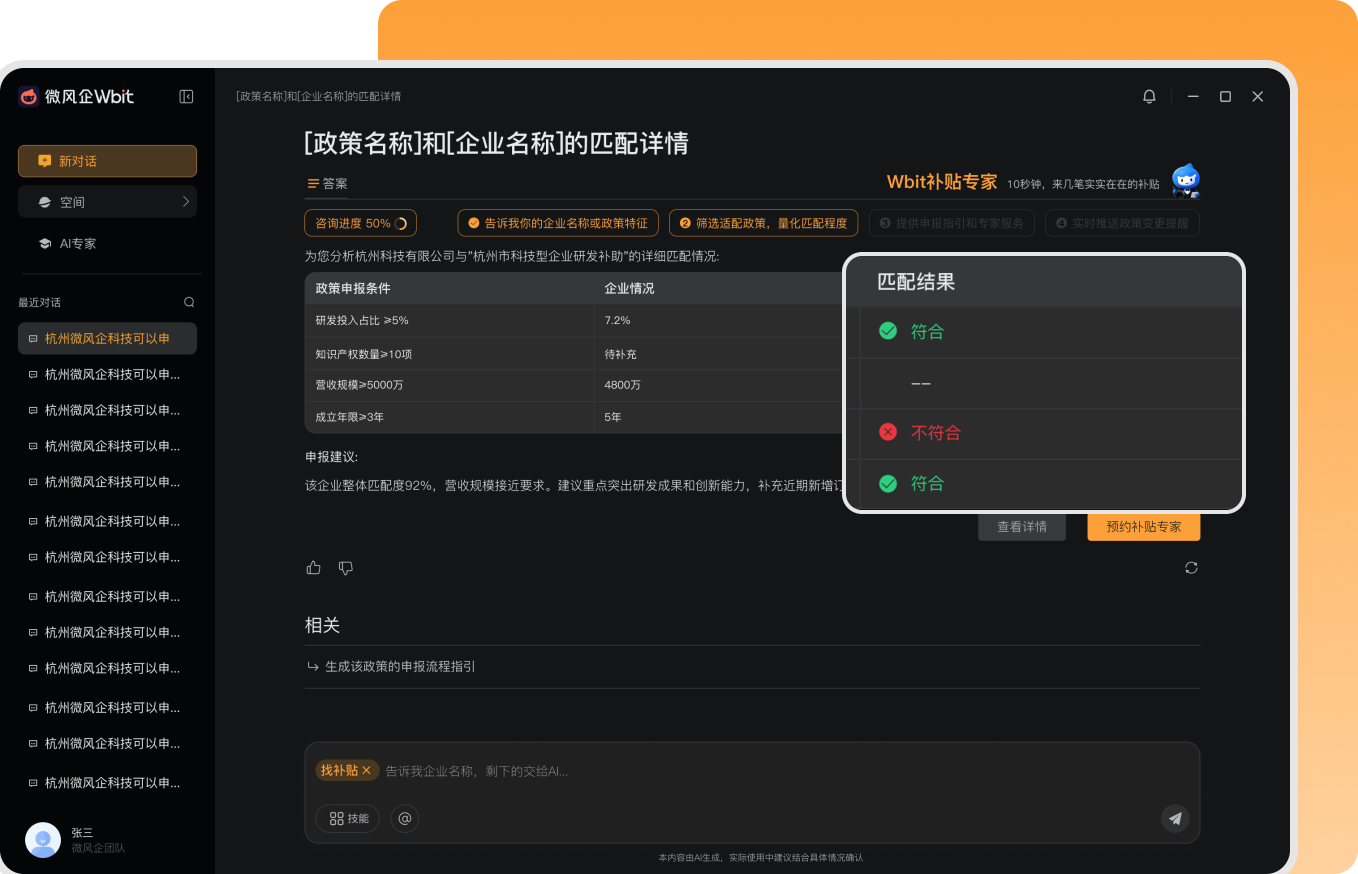 按行业/规模/地域/资质高效匹配政策;自动生成申报条件、材料清单与流程;实时推送更新,避免遗漏。